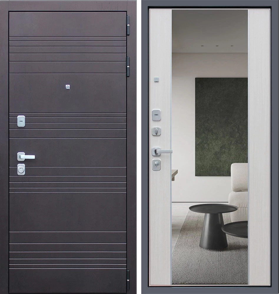 Надежная входная Дверь Дуэт с зеркалом премиум класса по цене 47 117 руб. Большая толщина стали защитит от проникновения в ваш дом, квартиру или коттедж. Используется очень качественная фурнитура: замки, цилиндры, ручки, защелки. Покрытие и отделка двери изготовлено под внимательным контролем производителя. Дверь имеет долгий срок службы и гарантию.
